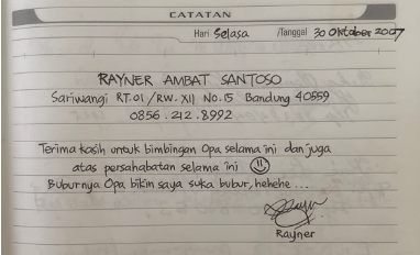 Yang pertama, jelas mama tertarik dengan tulisan indahnya. Kelihatannya ini tulisan anak muda. Lebih tertarik lagi, karena ternyata tulisan indah ini, hadir sampai 4X di buku tamu Opa. Penasaran, kira-kira anak muda ini punya cerita apa ya tentang Opa ? Iseng mama coba hubungi no HP yang tercantum disana. Dijawab… dan waktu mama minta kakak Rayner menulis tentang Opa, permintaan mama disambut dengan baik.